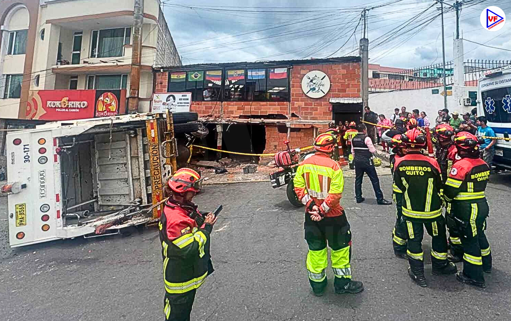 El accidente ocurrió en la intersección de las calles Machala y Puruhanta, cuando un camión recolector de basura perdió el control, volcó y se estrelló contra una vivienda.